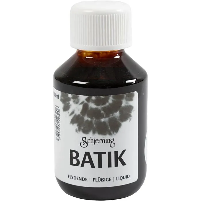 Vattenbaserad batikfärg till infärgning av bomullstextiler i färgbad m.m. 100 ml. färg räcker till 700 g vitt bomullstyg (den svarta färgen räcker till 350 g). Färgen tillsätts i vatten, kökssalt och fixeringssalt och tål därefter maskindisk.