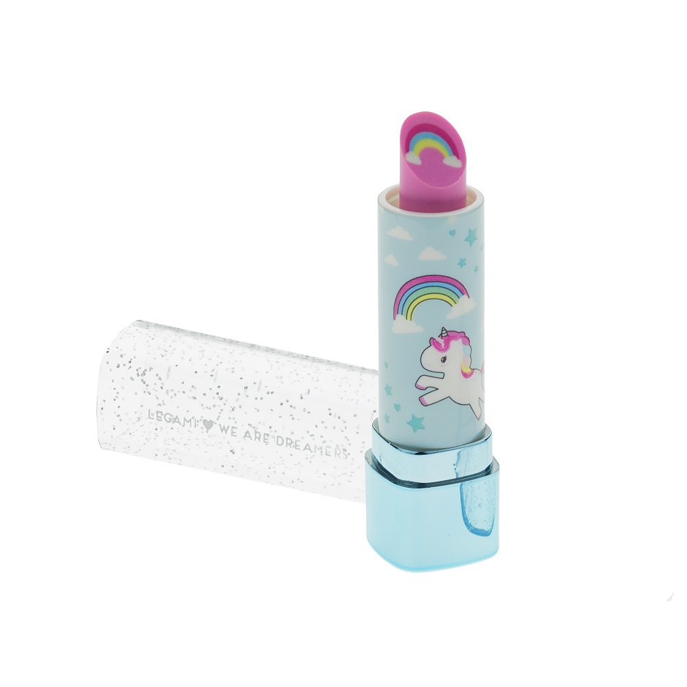 Doftande suddgummi i form av ett läppstift med enhörningsmotiv. Mått: diameter 2 cm x 7,2 cm.