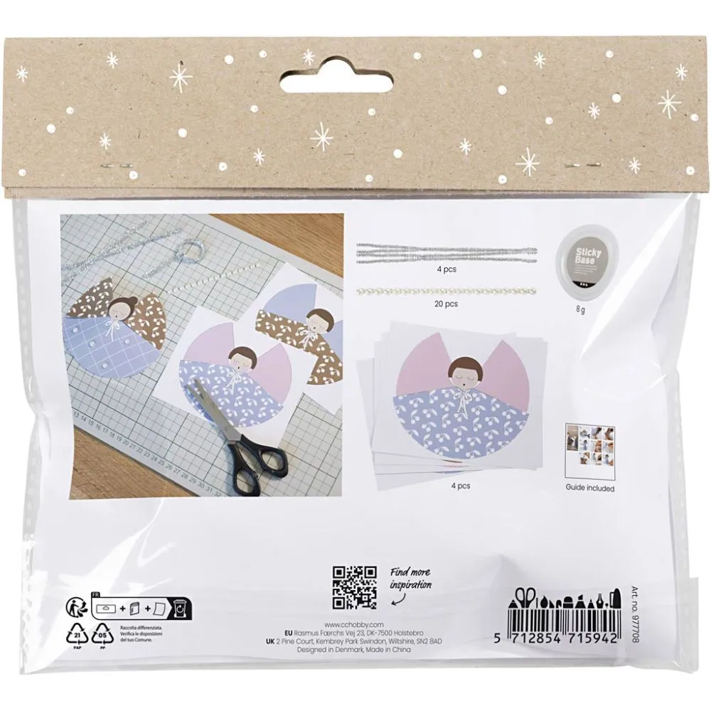 Änglar är utmärkta juldekorationer och nu har vi gjort det enkelt för dig att göra din egen julängel. Setet innehåller allt material du behöver för att göra fyra snygga pappersänglar. Du klipper, viker och limmar änglarna så att de kan stå på egen hand. Sedan gör du glorior utav glittriga piprensare som du fäster med Sticky Base. Slutligen dekorerar du dem med snygga halvpärlor, sedan är dina änglar klara att användas som juldekoration.