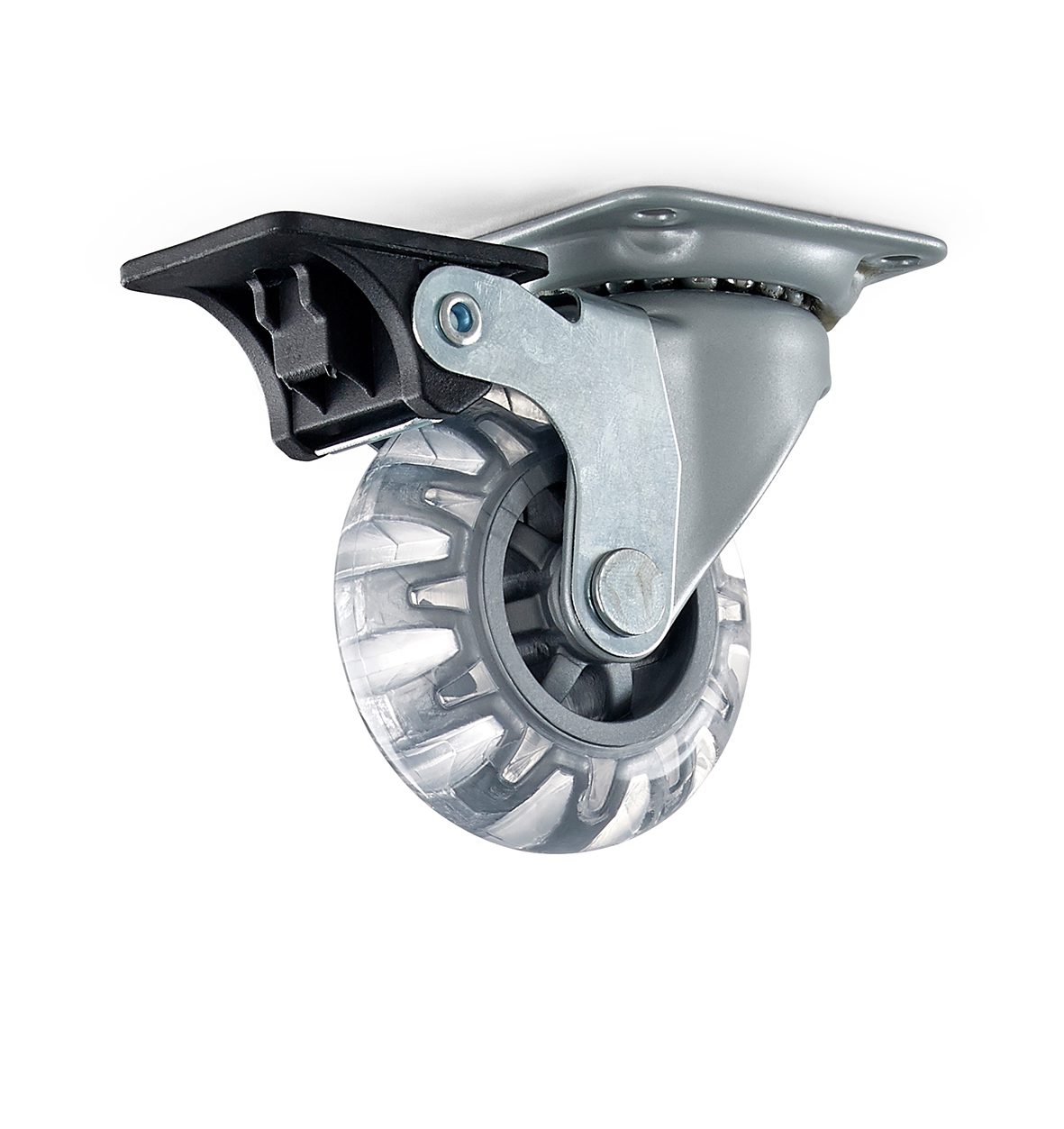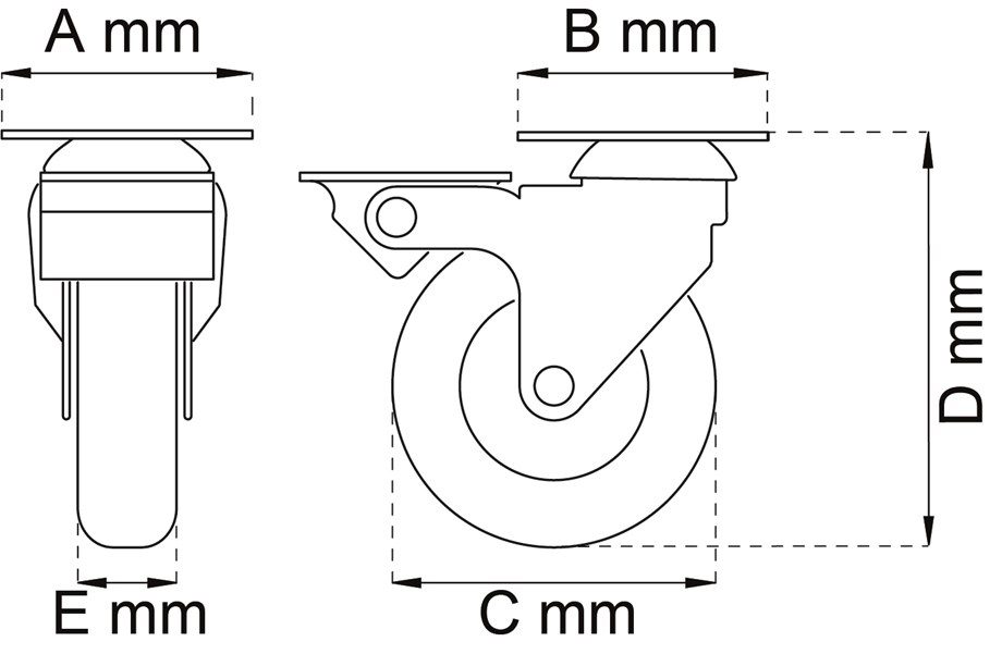 Svängbart länkhjul av stål. Hjul av PUR (Polyuretan). Måttangivelser i millimeter. Angivna värden för maxvikt är per hjul och beräknade och garanteras ej.