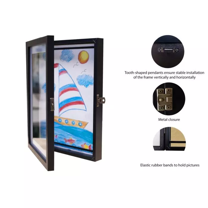 Ram som är öppningsbar framifrån, Designad för att samla t.ex barnteckningar i storlek A4. Teckningarna fästs med gummiband mot bakstycket som inte skadar motivet. Lätt att öppna och byta motiv eller lägga in nya.