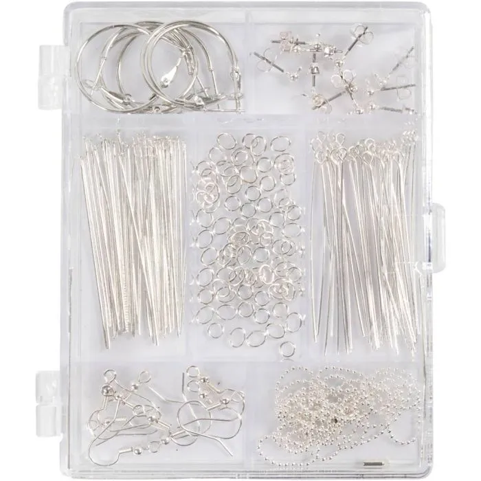 Drömmer du om att göra dina egna smycken? I så fall är vårt startset för att göra smycken ett perfekt val. Setet innehåller alla de viktigaste delarna du behöver för att skapa många olika typer av smycken. Du hittar creoler, franska öronkrokar och klassiska stift för att göra örhängen, tillsammans med pärlstavar och kulkedjor i två versioner – så du har massor att välja mellan i detta set..